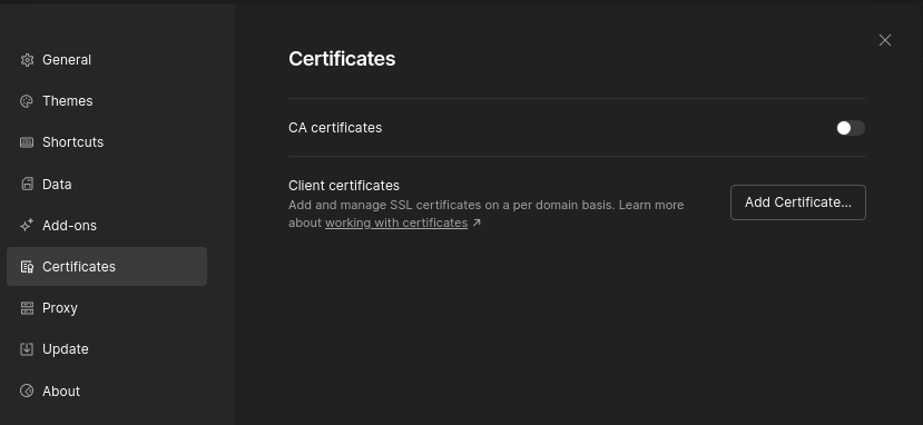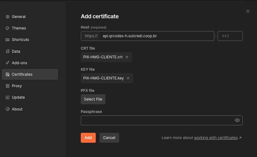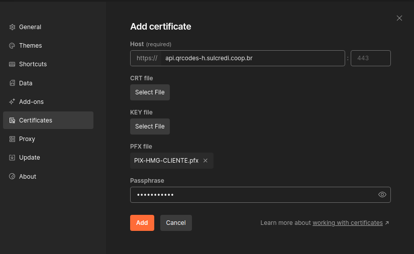 In Postman, go to the settings, select the Certificates tab, and click on "Add certificate...":